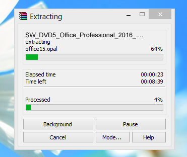 As soon as you select EXTRACT TO SW_DVD5_Office_Professional_2016_64Bit_English_MLF_X20-42432 you will see that the file will begin to extract and you will see a screen that looks like the image below. Once the file is done extracting the pop up will then leave the screen.